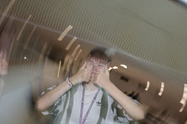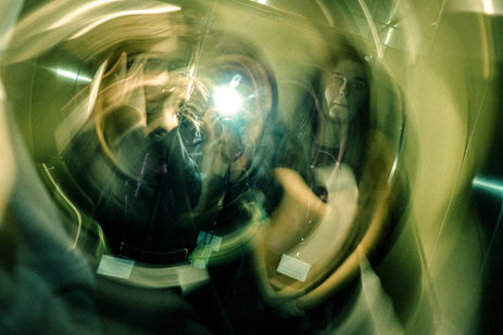 In this image, I took a photo in the mirror of the college elevator using a low shutter speed while rotating the camera clockwise to create a round motion blur effect. I love the fluid outcome of this photograph and it is one of my favorites of this photoshoot. I went for a feeling of delirium with the editing of this image; trying to experimenting with the color grading, contrast and texture. I made the photograph jungle green and chartreuse toned and made the motion blur lighter to make it appear Luminant. I love the grungy appearance that I created in this edit and composure of my image. As an experiment with motion blur and color grading, I believe I did a relatively good job. this has taught me camera settings and how to use adobe Lightroom to my advantage.